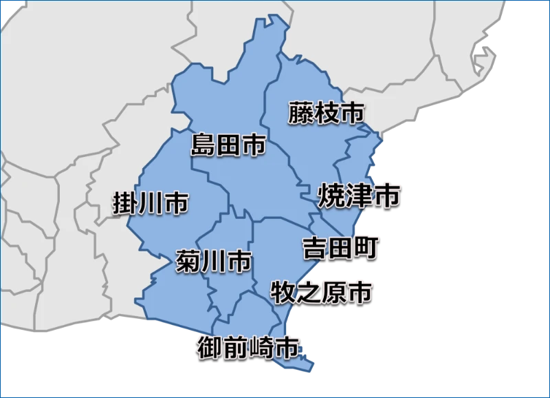 焼津市、藤枝市、島田市、吉田町、牧之原市、御前崎市、 菊川市、掛川市
